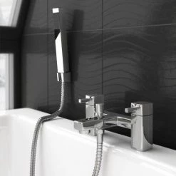The contemporary Amos bath shower mixer with shower kit features a mixture of soft elegant curves and straight edges, the Amos collection of bathroom taps would look great in any bathroom.