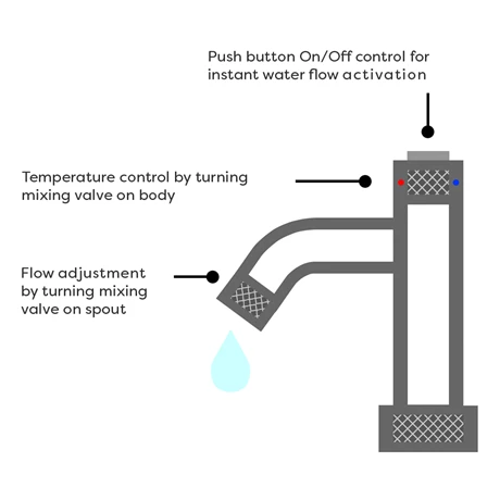 - Push button On/Off control for instant water flow activation
