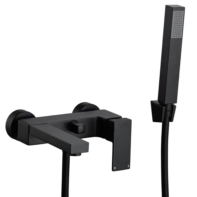 Choose this Arezzo Square Matt Black Wall Mounted Bath Shower Mixer Tap to complete the look of your contemporary bathroom. Crafted from brass, this high quality bath mixer tap will withstand the rigours of daily use. It features smart rounded shrouds for elegant wall mounting. The single lever tap is easy to operate, providing practical control over flow and temperature. Divert water between bath spout and handheld shower head quickly and easily thanks to the handy central knob. The eye catching finish of this matt black mixer tap gives it a designer feel that will complement other bathroom fittings beautifully. Includes a matching shower kit consisting of a rectangular handheld shower head, wall bracket and flexible hose.