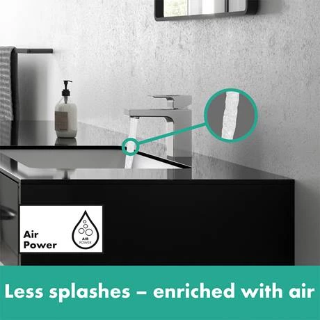 The geometric Vernis Shape variant, with its precise edges, stands for a visually striking look. This single lever basin mixer offers an economical way of adding designer elegance to your bathroom. AirPower technology adds generous amounts of air to the water, creating a soft, splash-free spray while EcoSmart technology reduces the flow rate to save water and energy.