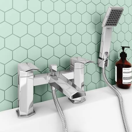 The modern Venice Geometric bath shower mixer tap marries angular lines with a contemporary shape, suitable for any modern bathroom. Create a stunning designer look in your bathroom with the Venice bath tap. Includes a shower kit consisting of a square paddle hand held shower head, wall bracket and flexible hose.